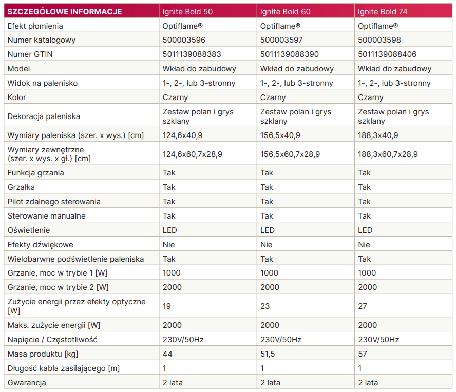 Kominki elektryczne Ignite Bold wnoszą ciepło oraz przytulną atmosferę do każdego wnętrza. Modele o rozmiarach: 50”, 60” i 74” można łączyć ze sobą modułowo, by stworzyć linię ognia o dowolnej długości w przestrzeniach prywatnych lub komercyjnych. Ściana tylna z lustrzanym odbiciem optycznie powiększa płytę paleniska, a wysoka, przyciemniana szyba przednia zapewnia doskonały widok na efekt płomienia Optiflame, rozświetlający swoim blaskiem realistyczne polana.