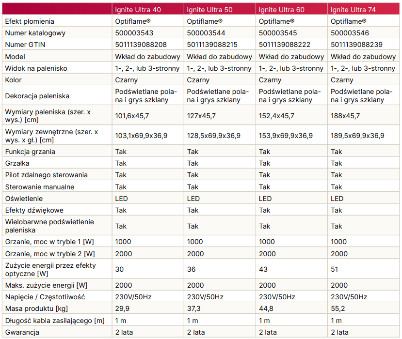 Ignite Ultra to seria innowacyjnych kominków elektrycznych o eleganckim wzornictwie, z nową technologią ognia Optiflame. Tworzy ona realistyczny efekt płomienia, który wraz z żarzącymi się polanami i odgłosem płonącego drewna dostarcza wielu wrażeń zmysłowych. Modele w czterech rozmiarach, z opcją zabudowy 1-, 2- lub 3-stronnej łatwo wkomponowują się w dowolny układ wnętrza. Ignite Ultra, wyposażone w energooszczędną technologię Comfort$aver, wnoszą ciepło, styl i unikalny klimat do każdej przestrzeni.