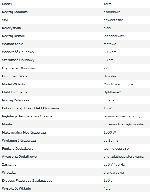 Za sprawą swojej zgrabnej, lekkiej sylwetki Terra świetnie wkomponowuje się w każdy styl aranżacji przestrzeni. Jej biała obudowa pięknie kontrastuje z intensywnym blaskiem ognia powstającym dzięki technologii Optiflame®. Hipnotyzujący ruch płomieni tworzy we wnętrzu przytulny nastrój, a ciepło, które daje kominek wzmaga uczucie relaksu i odprężenia.