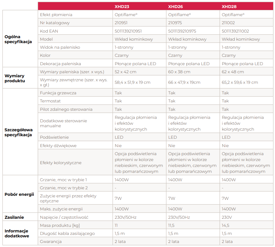 Elektryczne wkłady do zabudowy we wnęce ściennej lub do montażu w dowolnego typu obudowie. Modele XHD wyróżnia wiele unikalnych cech. Bezramowa szyba przednia umożliwia doskonały widok na płonący wewnątrz ogień. Wkłady te posiadają możliwość dostosowania jasności, wysokości oraz częstotliwości migotania płomieni, a także różnych kolorów podświetlenia paleniska do własnych potrzeb, jak i do charakteru wnętrza. Cyfrowy termostat oraz wbudowany moduł grzewczy zapewniają łatwą regulację temperatury. Wkłady XHD dostępne są w różnych rozmiarach.