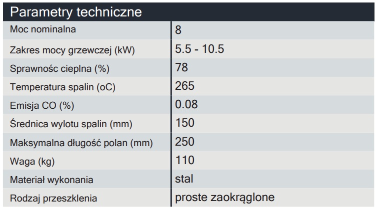 Maksymalne wykorzystanie ciepła dzięki elementom wykonanym z żeliwa: płyta górna, drzwi oraz ruszt. Komora spalania oraz korpus pieca, wykonane ze stali przeznaczonej do pracy w podwyższonych temperaturach.