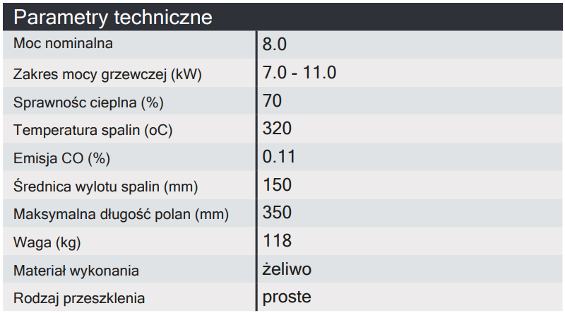 Ścianki paleniska wykonane z solidnego żeliwa o grubości 8 mm gwarantują długą trwałość oraz odporność na wysokie temperatury. Ozdobny płotek nie tylko podnosi walory estetyczne pieca, ale także zapewnia dodatkowe bezpieczeństwo, chroniąc przed przypadkowym wypadnięciem drewna.