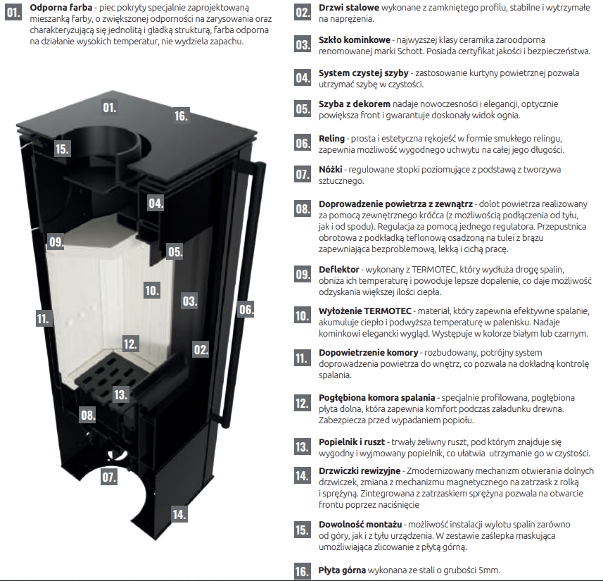 – dłuższe utrzymywanie temperatury dzięki wyłożeniu komory spalania materiałem akumulacyjnym TERMOTEC,