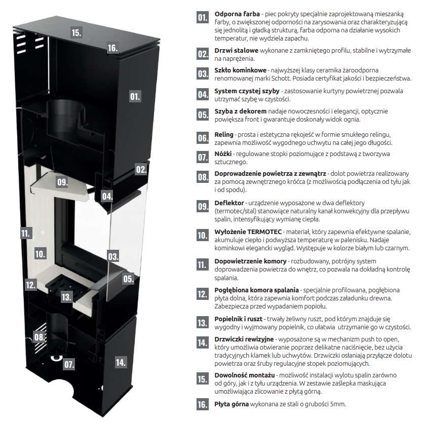 – dłuższe utrzymywanie temperatury dzięki wyłożeniu komory spalania materiałem akumulacyjnym TERMOTEC,
