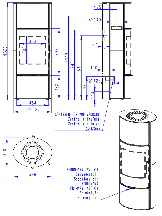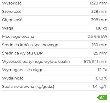 Akumulacyjny piec kominkowy odpowiedni do domów energooszczędnych. Drzwiczki pieca mają designerski nadruk na wielkopowierzchniowym przeszkleniu. Posiada system CDP – centralne doprowadzenie powietrza zewnętrznego. Standardowo możliwe jest podłączenie górnego lub tylnego odprowadzenia spalin. Dzięki dopływowi powietrza wtórnego, które opływa szybę drzwiczek, nie dochodzi do osadzania zabrudzeń. Komora spalania wyłożona szamotem. Regulacja dopływu powietrza pierwotnego i wtórnego za pomocą jednego elementu sterującego. W dolnej części pieca znajduje się zamykany schowek na drewno, który pozwala na przechowywanie mniejszej ilości drewna lub narzędzi kominkowych. Do pieca można dodatkowo dokupić elementy akumulacyjne, które emitują ciepło nawet do 5,5h. Wzornictwo wzmacniają elementy sterujące i w całości szklane