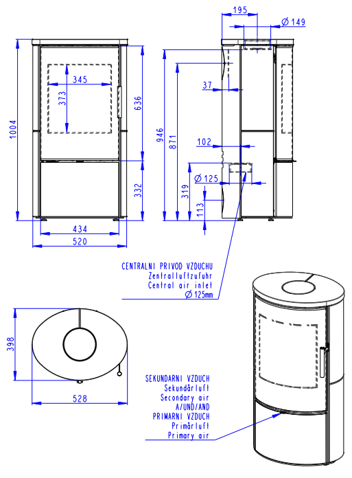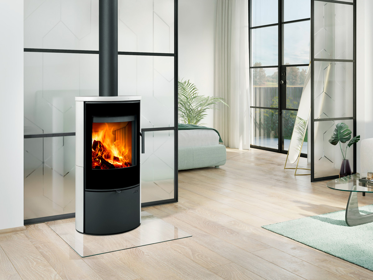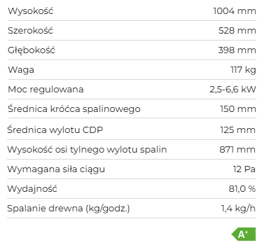 Piec kominkowy odpowiedni do domów energooszczędnych. Drzwiczki pieca mają designerski nadruk na wielkopowierzchniowym przeszkleniu. Posiada system CDP – centralne doprowadzenie powietrza zewnętrznego. Standardowo możliwe jest podłączenie górnego lub tylnego odprowadzenia spalin. Dzięki dopływowi powietrza wtórnego, które opływa szybę drzwiczek, nie dochodzi do osadzania zabrudzeń. Komora spalania wyłożona szamotem. Regulacja dopływu powietrza pierwotnego i wtórnego za pomocą jednego elementu sterującego. W dolnej części pieca znajduje się zamykany schowek na drewno, który pozwala na przechowywanie mniejszej ilości drewna lub narzędzi kominkowych.