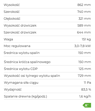 Piec kominkowy odpowiedni do domów energooszczędnych. Drzwiczki pieca mają designerski nadruk na wielkopowierzchniowym przeszkleniu. Piec posiada system CDP – centralne doprowadzenie powietrza zewnętrznego. Standardowo możliwe jest podłączenie górnego lub tylnego odprowadzenia spalin. Dzięki dopływowi powietrza wtórnego, które opływa szybę drzwiczek, nie dochodzi do osadzania zabrudzeń. Komora spalania wyłożona szamotem. Regulacja dopływu powietrza pierwotnego i wtórnego za pomocą jednego elementu sterującego. W dolnej części pieca można przechowywać mniejsze zapasy drewna.